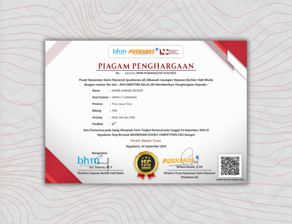 24/09/2023 - Pusat Kejuaraan Sains Nasional (PUSKANAS) yang dinaungi Yayasan Berlian Hati Mulia ada untuk membantu generasi masa depan agar dapat tumbuh lebih berkembang dan dapat meningkatkan kemampuan diri. ISC adalah sebuah kompetisi sains tingkat nasional yang diadakan untuk menjadi ajang berkompetisi dalam sains. Kompetisi ini bisa diikuti bagi peserta didik jenjang SD/MI, SMP/MTs, SMA/MA/SMK, dan Mahasiswa.