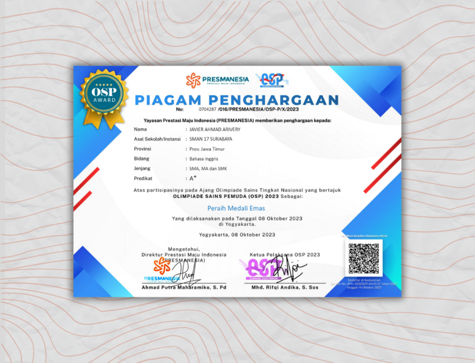 08/10/2023 - Prestasi Maju Indonesia (Presmanesia) Hadir untuk membantu generasi masa depan agar dapat tumbuh lebih berkembang dan dapat meningkatkan kemampuan diri agar mampu bersaing. OSP (Olimpiade Sains Pemuda) adalah sebuah event kompetisi sains tingkat nasional. Kompetisi ini bisa diikuti bagi peserta didik jenjang SD/MI, SMP/MTs, SMA/MA/SMK, dan Mahasiswa.
